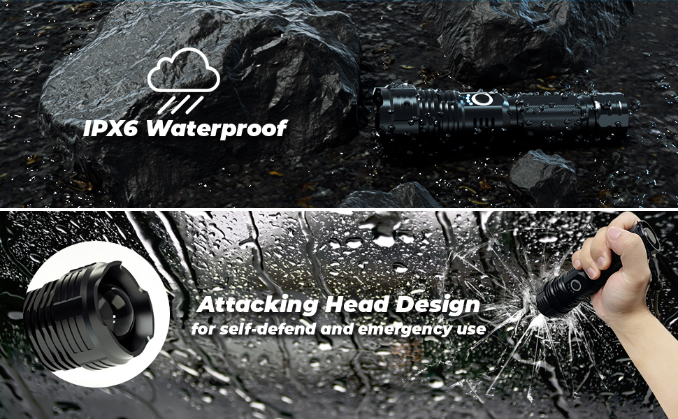 Der Fall istSchutzklasse IPX6, wodurch esbeständig gegen Spritzwasseraus jeder Richtung. Im Notfall können Sie die Spitze Ihrer Lampe alsein Glasbrecher. Es hat eine praktische Reisegröße und istkompakt und leichtzum Mitnehmen in der Tasche.