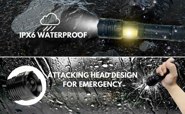 Der Fall istSchutzklasse IPX6, wodurch esbeständig gegen Spritzwasseraus jeder Richtung. Im Notfall können Sie die Spitze Ihrer Lampe alsein Glasbrecher. Es hat eine praktische Reisegröße und istkompakt und leichtzum Mitnehmen in der Tasche.
