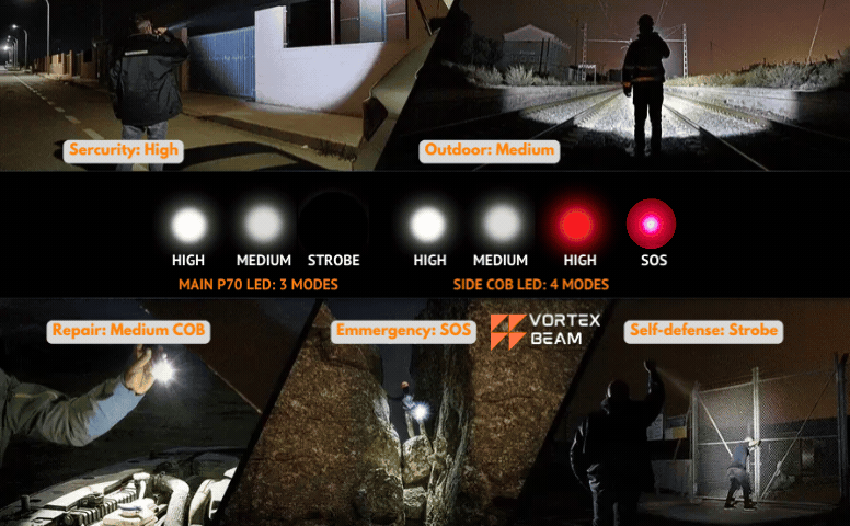 3 Lichtmodifür Haupt-X70 LED plusein Teleskopzoom 4 LichtmodifürCOB-Seiten-LED.Strobe- und Rot-SOS-Modistehen für den Notfall und zur Selbstverteidigung zur Verfügung.