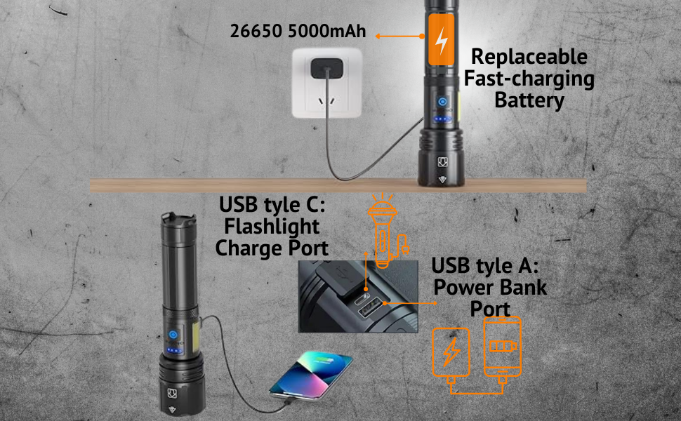 Wiederaufladbar26650 5000mAh Akkuist konzipiert fürÜberlegene Leistung und längere Lebensdauer.Seine erweiterten Ladefunktionen sind bahnbrechend – ausgestattet mit einem USB-Anschluss Typ C zum schnellen Aufladen und einem Anschluss Typ A, der die Taschenlampe in eine Powerbank verwandelt, mit der Sie Ihre Geräte im Handumdrehen aufladen können.